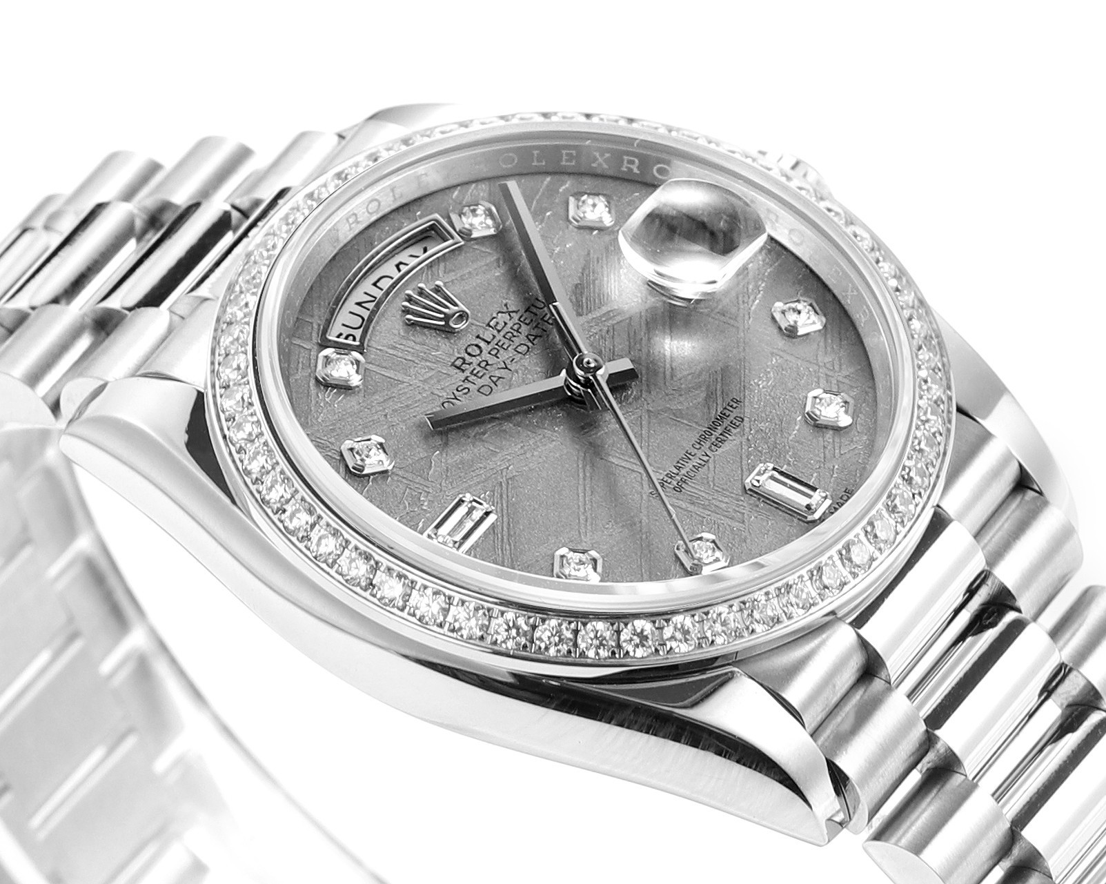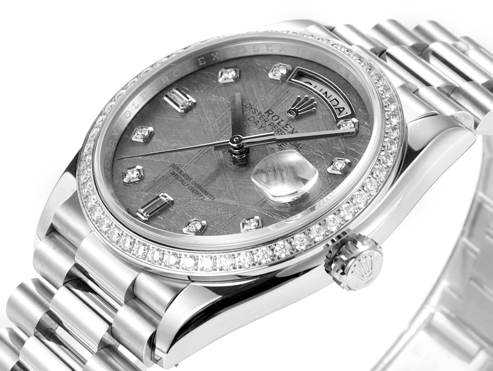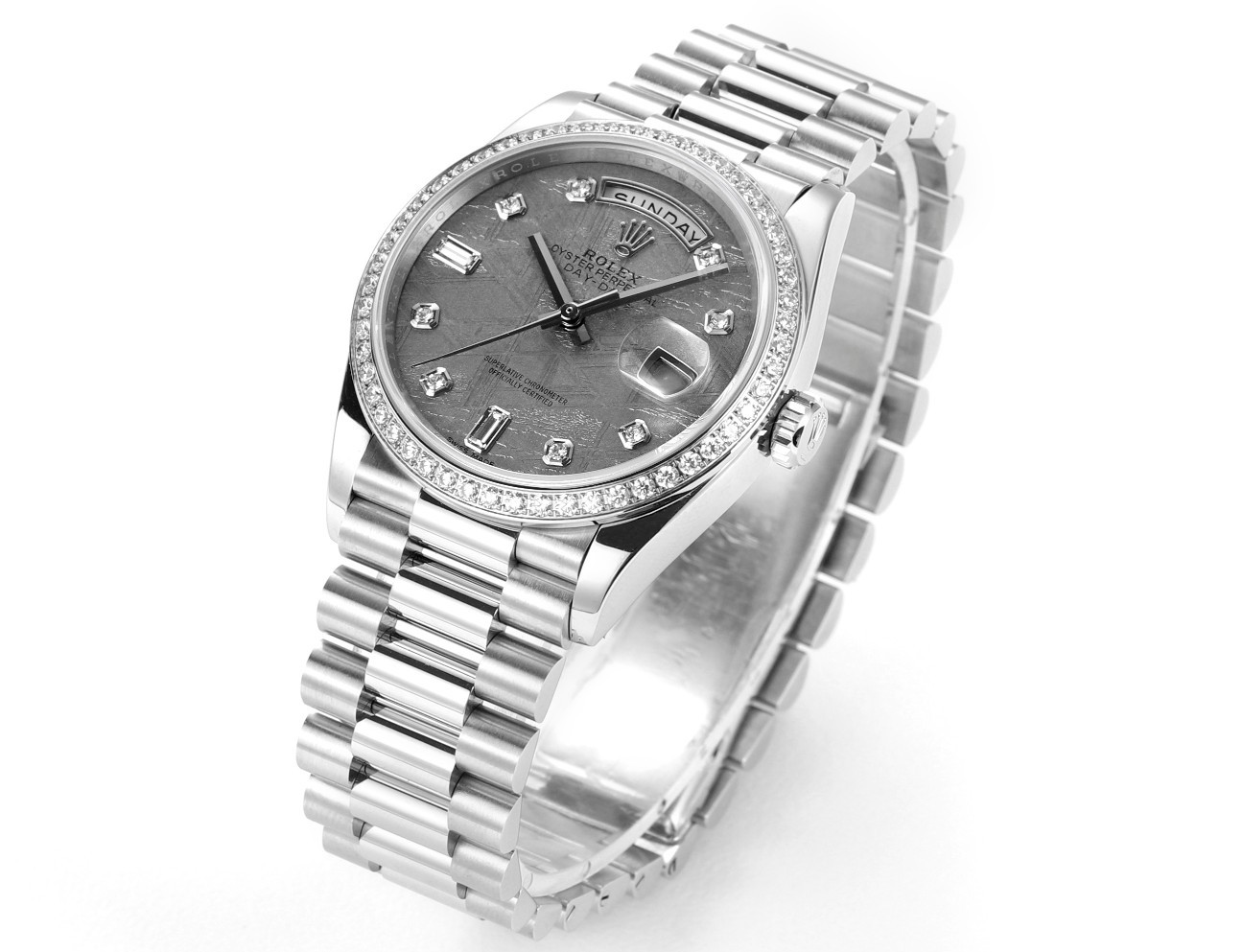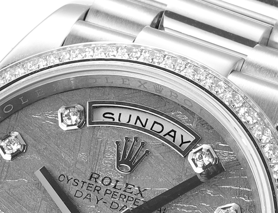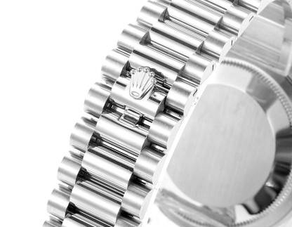 ロレックスは、卓越した時計製造の基準を体現するスイスを代表する高級時計ブランドです。1956年に誕生したデイドゥエイトは、12時位置のアーチ型ウィンドウで曜日を完全表記する世界初のカレンダー腕時計として歴史に名を刻み、以来、多くのリーダーやビジョナリーに愛用されてきました。本モデルは、18Kゴールド、18Kホワイトゴールド、18Kエバーローズゴールド、または950プラチナといった貴金属のみで仕上げられ、専用設計のプレジデントブレスレットと相まって、比類なき存在感を放ちます。曜日表示は26言語から選択可能で、真のグローバルかつパーソナルな時計としての地位を確立しています。卓越した歴史的価値:ロレックスのフラッグシップモデルとして、1956年の登場以来「大統領の時計」と称され、世界中の政界・経済界のリーダーたちに選ばれてきた、成功と威信の象徴です。独創的な機能美:12時位置に世界初のフルスペル曜日表示ウィンドウを配置し、日付とともに「ミッドナイトミラクル」と呼ばれる瞬切り機構で変更する、機能性と美学を見事に融合させたデザインが特徴です。最高峰の素材と技:ケースからブレスレットに至るまで、18K金や950プラチナなどの貴金属のみを使用。エメラルドカットダイヤモンドや天然のパールマザーなど多様な文字盤と組み合わせられ、ロレックスが追求する微細なディテールへのこだわりが光ります。先端技術を結集した高性能ムーブメント:完全自社製の3255型機械式ムーブメントを搭載。クロノエネジー脱進機やパラクロムひげぜんまいなど数々の特許技術を採用し、約70時間のパワーリサーブと超々天文台証明を取得した卓越した精度と信頼性を実現しています。象徴的なプレジデントブレスレット:1956年のデイドゥエイトの発売とともに登場した、三連の半円形リンクが特徴の専用ブレスレット。貴金属製で、内蔵されたセラミック部品により耐久性と柔軟な着用感を両立し、その存在感と快適さは時計の風格をさらに高めます。